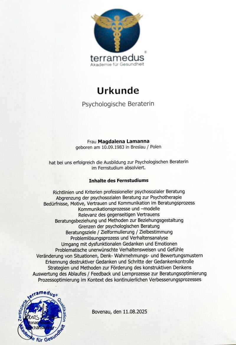 Als zertifizierte psychologische Beraterin begleite ich dich mit Herz, Klarheit und fachlicher Kompetenz durch belastende Lebensabschnitte. Ich schaffe einen sicheren Raum, in dem du einfach sein darfst – mit all deinen Gefühlen, Gedanken und Unsicherheiten. Gemeinsam finden wir heraus, was dich stärkt, was dich blockiert und welche nächsten Schritte sich gut anfühlen.